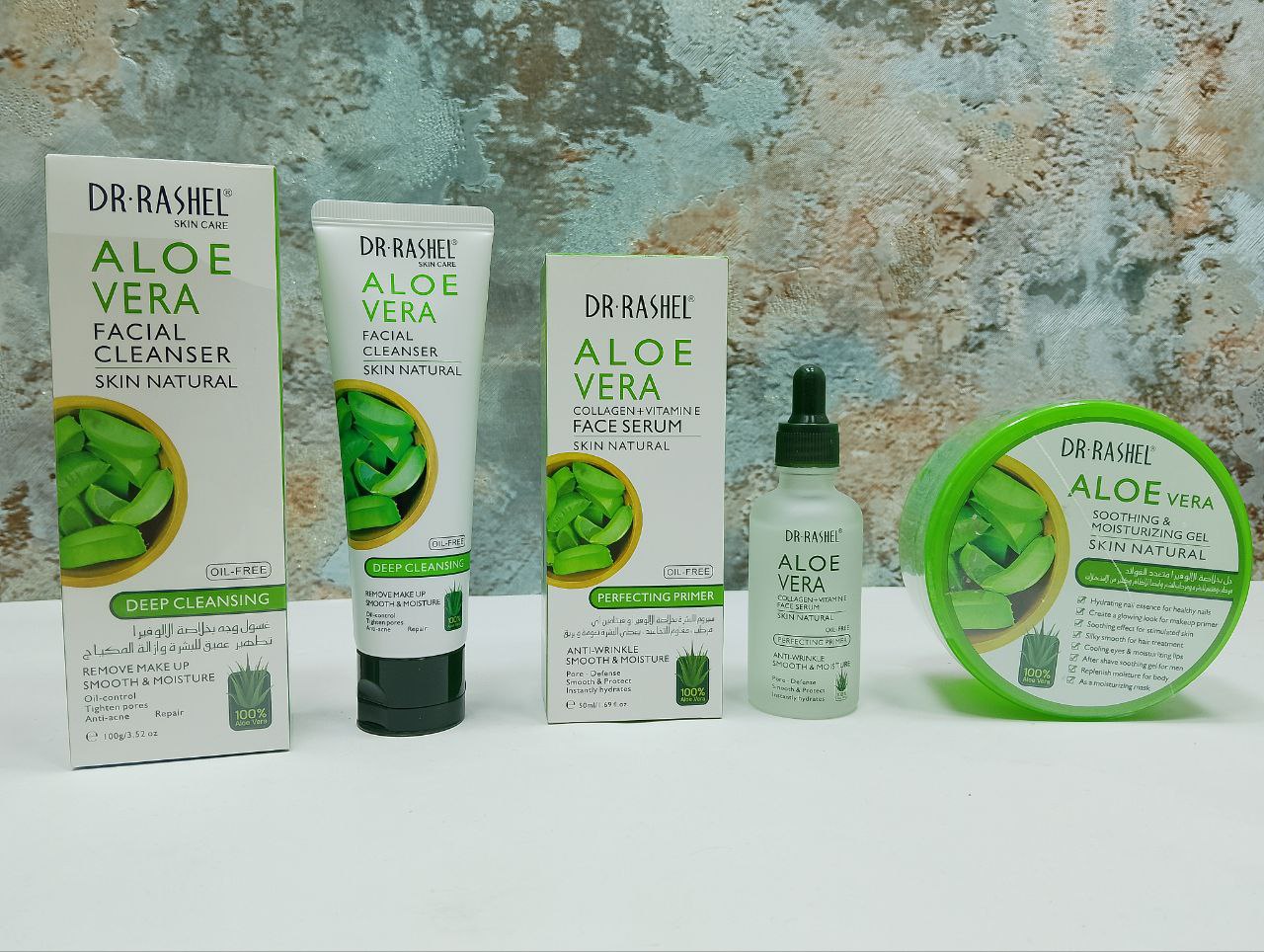 اكتشفي سر البشرة النضرة مع باقة **Dr. Rashel Aloe Vera** المكونة من ثلاث خطوات أساسية للعناية اليومية ببشرتك.